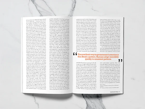 For the cover, I chose to photograph a fruit bowl that I arranged as a still life. I manipulated the image to resemble a Norman Rockwell painting in an effort to highlight the feature story. I used san serif typeface to bring the balance of a modern feel to the traditional image. My exploration of this connection was a fascinating journey that cast a new lens on the deliberate intersection of beauty and function.